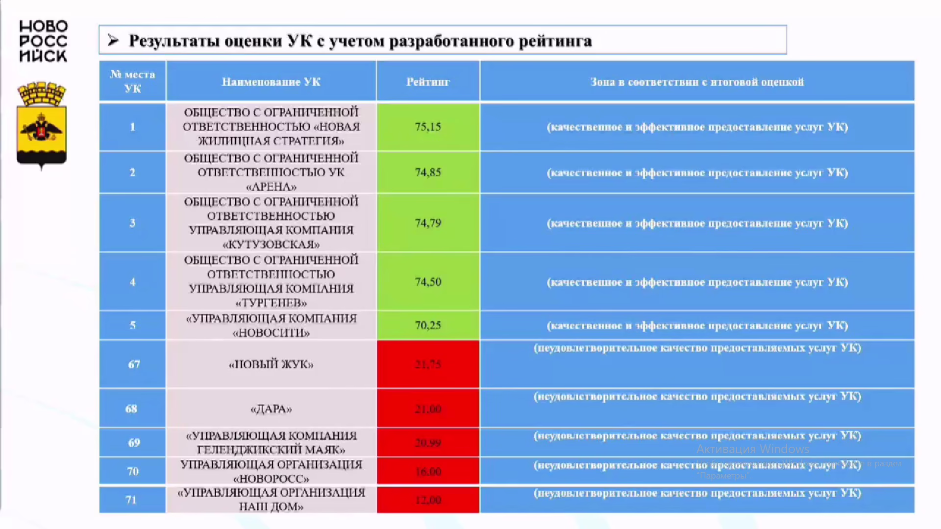 Список худших УК в рейтинге мэрии Новороссийска